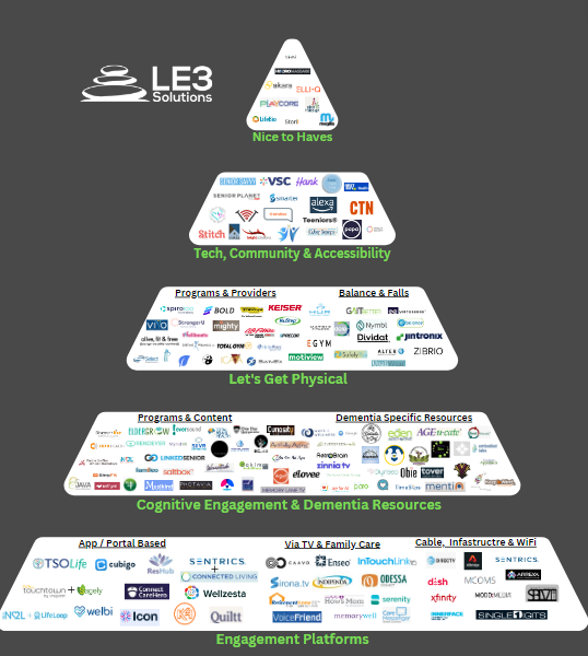 As LE3 Solutions continues to track and update all things around engagement that impacts residents and their families, there is one new shift in verbiage to note. Resident engagement is where we started and was the focus of this map, and our business. However, as we get further into the space, we recognize how much bigger the conversation needs to be on and around engagement. Our vernacular has shifted and we know that engagement truly is community wide, not just resident facing. How people spend their day doing things that are meaningful and enjoyable is absolutely community wide, noting community extends far beyond the walls. Resident engagement spills over into the external community via accessibility and opportunity.